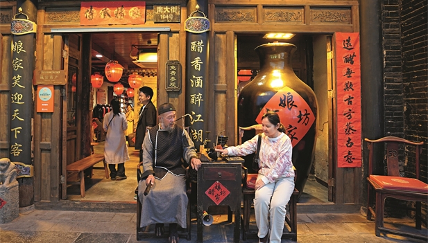 10 de mayo de 2024. Una turista charla con el dueño de una tienda de vinagre en la calle Nandajie de la antigua ciudad de Pingyao.
