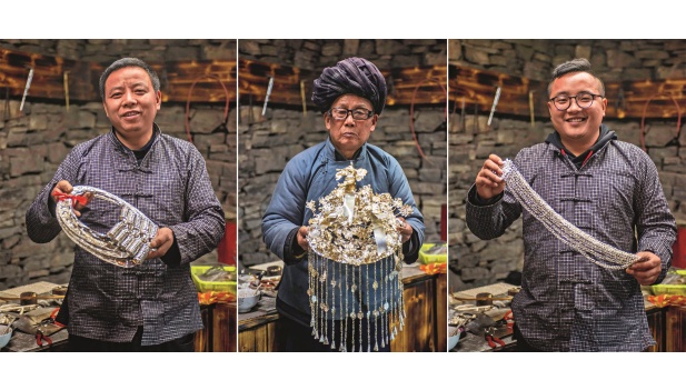 28 de febrero de 2019. Long Jitang (centro), oriundo del distrito de Fenghuang, en la provincia de Hunan, muestra adornos de plata tradicionales de la etnia miao, junto a su hijo Long Xianhu (izq.) y su nieto Long Jianping. Las tres generaciones han heredado el arte de forjar estos adornos. Xinhua