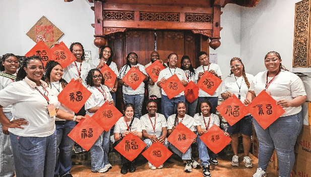 3. 14 de julio de 2025. Jóvenes estadounidenses muestran la caligrafía con el carácter chino “福”, que significa “buena fortuna” en español, tras aprenderlo en la Escuela Secundaria N.o 8 de Beijing. Wei Yao