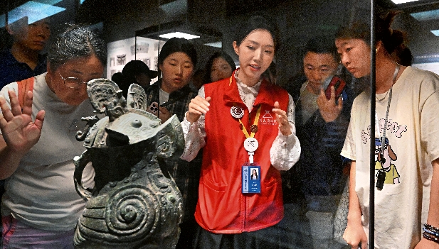 26 de abril de 2024. Una guía presenta al público el zun (un recipiente ritual) en forma de búho de Fu Hao en el Museo de Henan. Xinhua ![]() 26 de abril de 2024. Recipiente cuadrado decorado con lotos y grulla es exhibido en el Museo de Henan. Xinhua Flauta de hueso Jiahu Fabricada hace más de 8000 años, la flauta de hueso Jiahu fue desenterrada en el yacimiento neolítico de Jiahu en Wuyang, en el centro de Henan, en 1987. Es el instrumento de viento más antiguo y mejor conservado descubierto en China hasta la fecha. Conocida como “la primera flauta de China”, marca un hito clave en la historia de la música china. La flauta está hecha de un hueso hueco del ala de una grulla, con múltiples orificios para los dedos perforados con notable precisión. El sonido de este instrumento es puro y etéreo. A juzgar por los marcadores equidistantes de la flauta, así como por las notas que produce, su longitud, diámetro y ubicación de los orificios fueron cuidadosamente calculados por su creador. Lo más sorprendente de este antiguo instrumento es que puede tocar una escala de siete notas casi completa. Este hallazgo desafía la idea arraigada de que la escala de siete notas se originó en Occidente, al demostrar que, hace 8000 años, los antiguos chinos ya poseían un conocimiento avanzado de la teoría musical. Jin de bronce con diseño de nubes El jin de bronce es un soporte para recipientes de vino utilizado por la nobleza en banquetes o sacrificios durante la dinastía Zhou. El jin de bronce con diseño de nubes, que data del Período de Primavera y Otoño (770-476 a. C.), es una reliquia destacada en el Museo de Henan. Su cuerpo principal presenta intrincados diseños de nubes caladas, sostenido por doce bestias con forma de tigre que sirven como patas de mesa y decorado con doce bestias con forma de dragón alrededor de su parte superior, que parecen estar a punto de beber un sorbo de vino. Este jin de 95 kilogramos se fundió mediante la técnica de la cera perdida, un método de fundición que permitía producir patrones más complejos en comparación con el moldeado en arcilla. Esta técnica era uno de los tres principales métodos de fundición en la antigua China. El descubrimiento de esta impresionante reliquia de bronce demuestra que la fundición con la técnica de la cera perdida había alcanzado un nivel avanzado en China a mediados del Período de Primavera y Otoño. El jin fue encontrado gravemente dañado durante una excavación en 1978. Al no existir casos previos de restauración de este tipo como referencia, los expertos del Museo de Henan emprendieron un meticuloso proceso de restauración que incluyó 26 procedimientos, a lo largo de casi tres años, para devolverle su antiguo esplendor. Tablilla de oro de la emperatriz Wu Zetian En mayo de 1982, un agricultor del distrito de Dengfen, en Henan, descubrió una tablilla de oro alojada en una grieta de las montañas Songshan, veneradas como una de las cinco montañas sagradas de China desde la antigüedad. Identificada como una pieza de Wu Zetian, ofrece información sobre los últimos años de la única monarca china. Esta reliquia de la dinastía Tang (618-907) mide 36,2 centímetros de largo, 8 centímetros de ancho y pesa 223,5 gramos. La inscripción de 63 caracteres declara que la emperatriz seguía devotamente el taoísmo y anhelaba la inmortalidad. Le encomendó a un enviado llamado Hu Chao la tarea de ir a las montañas Songshan en su nombre para entregar la tablilla de oro y rezar a las deidades taoístas por su salud. La fecha inscrita corresponde al séptimo día del séptimo mes del calendario tradicional chino del año 700 d. C. Como la única gobernante mujer en la historia de China, Wu gobernó durante más de cuatro décadas. A pesar de su importancia histórica, hasta la fecha se han encontrado pocos artefactos directamente relacionados con ella, salvo algunas inscripciones lapidarias. Esto se debe a que la mayoría permanecen enterrados en el Mausoleo de Qianling, que aún no se ha excavado por razones de conservación. Por lo tanto, esta tablilla de oro sigue siendo el único artefacto conocido asociado con ella, el cual ofrece valiosa información sobre su vida, en particular sobre sus últimos años. Orquesta de Música Antigua de Huaxia En Henan se han descubierto numerosos instrumentos musicales de diversos períodos históricos. No solo presentan formas únicas, sino que también exhiben rangos y tonos tonales comparables a los de la música moderna. Para ayudar al público moderno a apreciar la música china antigua, el Museo de Henan fundó la Orquesta de Música Antigua de Huaxia en el año 2000. Esta compañía profesional se dedica a recrear las tradiciones musicales de China desde la prehistoria hasta las dinastías Ming (1368-1644) y Qing (1644-1911), al centrarse en la recreación de instrumentos musicales tradicionales basándose en los hallazgos de la investigación arqueológica. Ha producido instrumentos antiguos como el bianzhong (un conjunto de campanas de bronce), los tambores de fénix y las flautas de hueso. Desde su debut el 1 de abril de 2000, la Orquesta de Música Antigua de Huaxia se ha convertido en una de las principales atracciones del museo. Con dos presentaciones diarias en la sala de conciertos, ofrece más de 600 espectáculos al año. Sus presentaciones son tan populares que se suelen agotar las entradas rápidamente durante los fines de semana y días festivos. En la sala de conciertos, el museo emplea tecnologías digitales como proyecciones holográficas y multimedia LED para presentar una exposición multidimensional de reliquias culturales y hallazgos arqueológicos. A través de estos recursos tecnológicos, el público no solo disfruta de la música, sino que también se sumerge en escenas históricas de diversos períodos. El museo también ha creado una sala de conciertos en línea en su sitio web oficial, que ofrece información sobre la música a