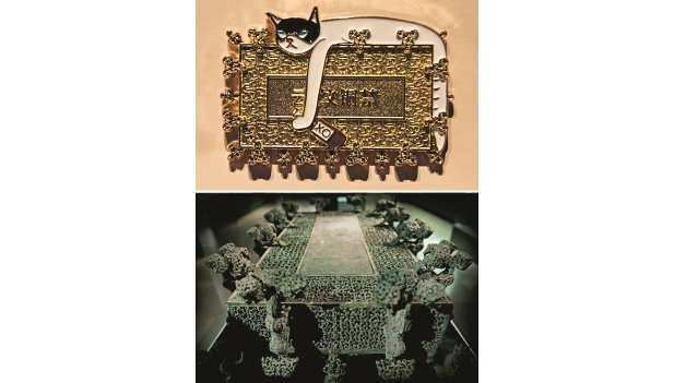 El jin de bronce (un soporte para recipientes de vino) con diseño de nubes y un imán inspirado en él. Xinhua